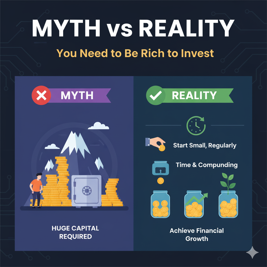 The Reality: This is one of the biggest myths that prevents people from starting. In today’s market, you can begin investing with very small amounts. Many brokers allow you to buy fractional shares, meaning you can invest as little as a few hundred rupees in a high-priced stock. The focus should be on starting and consistency, not on having a large lump sum.