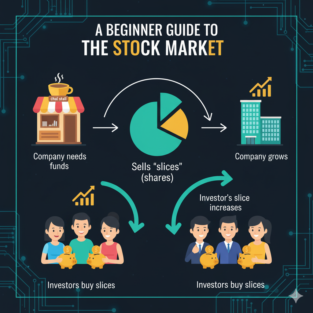Imagine you have a small business, say, a thriving chai stall. If your stall becomes very popular and you want to expand, you might need more money than you currently have. One way to get that money is to sell a tiny piece of ownership in your stall to other people. These tiny pieces of ownership are called shares or stocks.