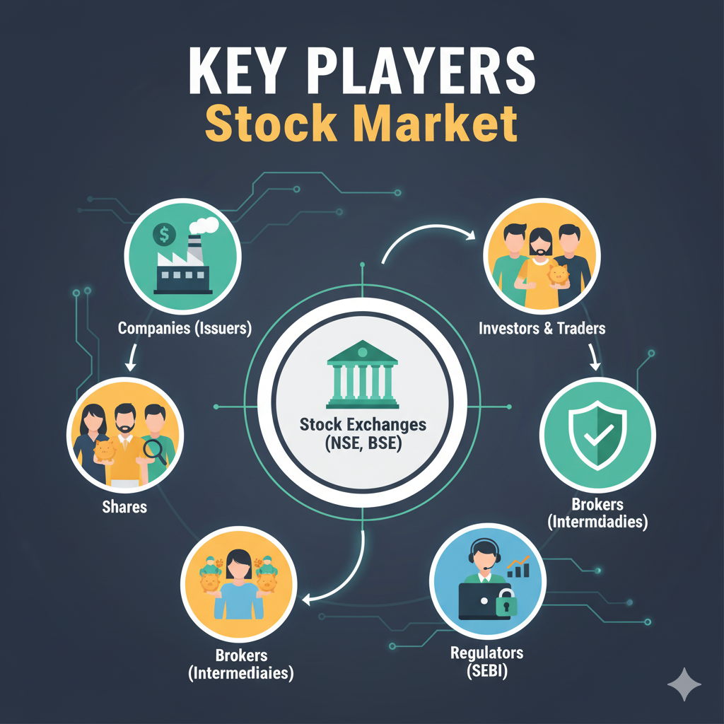 - Regulators: Bodies that oversee the market to ensure fairness, transparency, and protect investors (e.g., SEBI – Securities and Exchange Board of India).